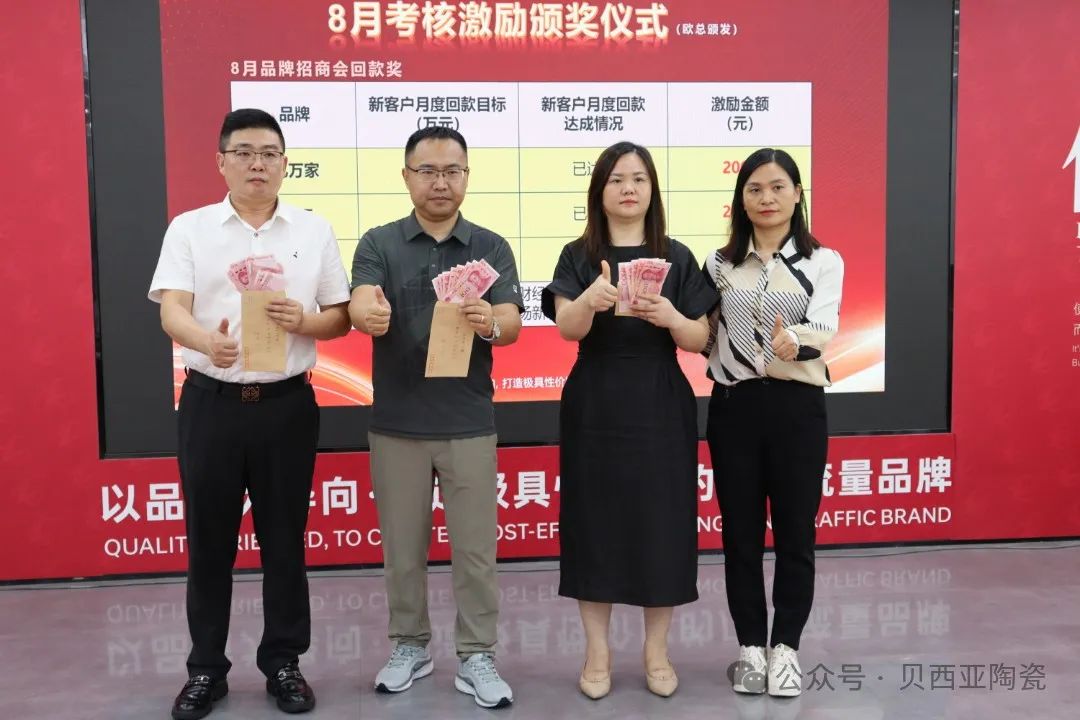 對(duì)標(biāo)先進(jìn)添干勁,凝聚合力謀發(fā)展。成績(jī)的取得離不開全體銷售人員的辛勤付出和團(tuán)隊(duì)的緊密協(xié)作。會(huì)議上,對(duì)8月優(yōu)秀個(gè)人及團(tuán)隊(duì)進(jìn)行了表彰并現(xiàn)場(chǎng)發(fā)放現(xiàn)金獎(jiǎng)勵(lì)。表彰先進(jìn),樹立標(biāo)桿,激揚(yáng)著大家汲取榜樣力量,凝聚起上下同心、決戰(zhàn)決勝強(qiáng)大合力,為品牌的發(fā)展作出新的更大貢獻(xiàn)。
